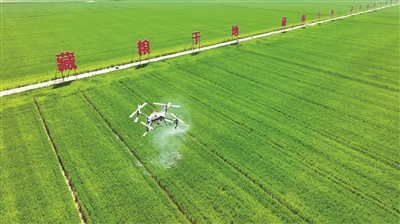 近年來,江蘇省宿遷市宿豫區(qū)多措并舉推動耕地保護責任落實,加快現(xiàn)代農(nóng)業(yè)產(chǎn)業(yè)園核心區(qū)建設,保障糧食穩(wěn)產(chǎn)增產(chǎn)。圖為近日,在該區(qū)新莊小麥單產(chǎn)提升示范區(qū),無人機正在進行植保噴灑作業(yè)。朱冠軍 攝