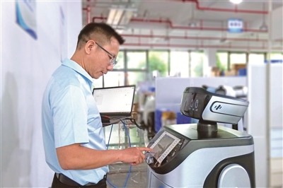 福建省福州市,服務(wù)機(jī)器人應(yīng)用技術(shù)員謝茂皇正在對(duì)機(jī)器人產(chǎn)品的功能進(jìn)行調(diào)試。周磊 攝