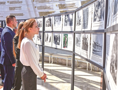 定格共同的勝利,重溫跨越時(shí)空的二戰(zhàn)記憶。“銘記歷史 開創(chuàng)未來”——紀(jì)念中國人民抗日戰(zhàn)爭暨世界反法西斯戰(zhàn)爭勝利80周年圖片展正在白俄羅斯國立偉大衛(wèi)國戰(zhàn)爭歷史博物館展出。圖為觀眾在參觀展覽。新華社記者 張超群 攝