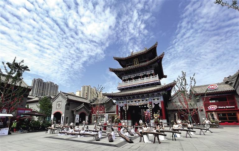 中國(guó)甘肅網(wǎng)6月28日訊 據(jù)蘭州日?qǐng)?bào)報(bào)道(記者 李沛珂 攝)6月27日,由《蘭州日?qǐng)?bào)》、西北民族大學(xué)、蘭州老街共同發(fā)起的“數(shù)箏齊奏頌黨恩”活動(dòng)在蘭州老街舉行。來自西北民族大學(xué)音樂學(xué)院古箏專業(yè)“明·凈“箏團(tuán)的40多位師生,齊奏《我的祖國(guó)》、《盛世國(guó)樂》、《唱支山歌給黨聽》等耳熟能詳?shù)慕?jīng)典曲目,吸引路過的市民紛紛駐足圍觀,贏得陣陣掌聲。