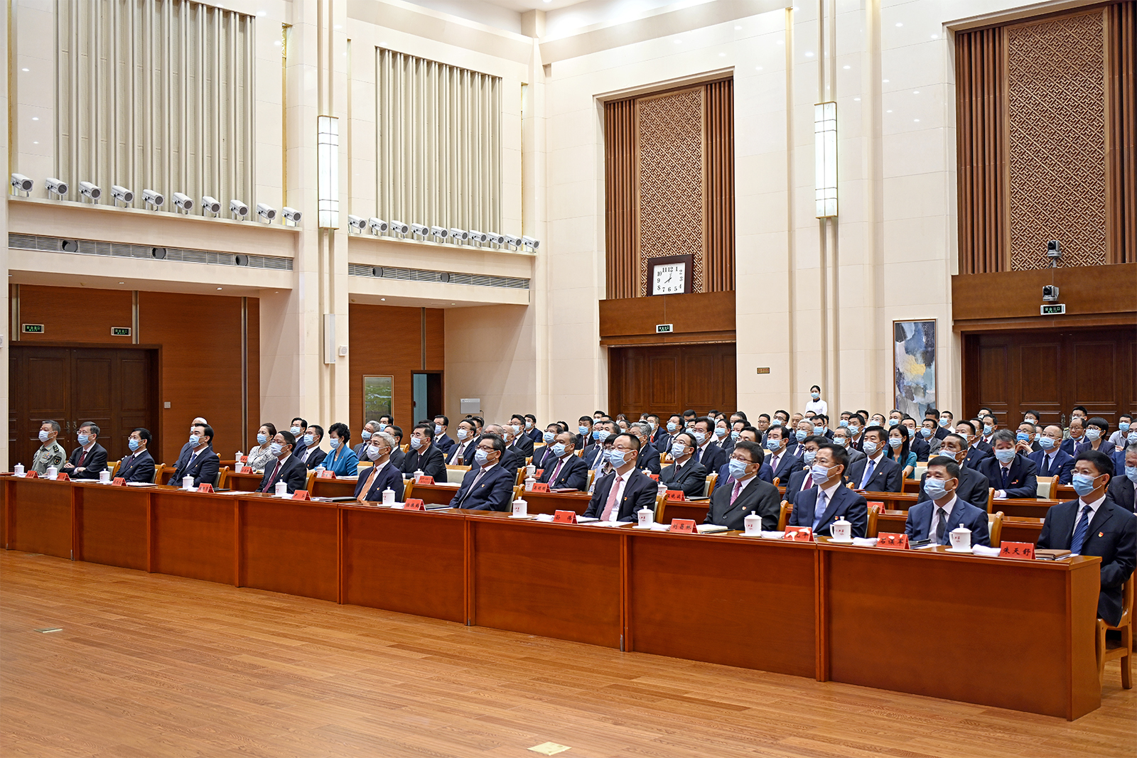 7時53分許,在歡快的樂曲聲中,習(xí)近平等黨和國家領(lǐng)導(dǎo)人來到天安門城樓主席臺,會場爆發(fā)出熱烈的掌聲。8時整,慶祝大會開始,中國人民解放軍聯(lián)合軍樂團奏響雄壯的《義勇軍進行曲》,尹弘、任振鶴等全體起立,隨北京現(xiàn)場一起高唱中華人民共和國國歌,目視大屏幕里鮮艷奪目的五星紅旗冉冉升起,在天安門廣場上空迎風(fēng)飄揚。在熱烈的掌聲中,習(xí)近平總書記發(fā)表重要講話,大家認真聆聽、專心筆記,第一時間深刻學(xué)習(xí)領(lǐng)會,不時報以熱烈的掌聲。