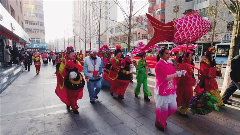 社區(qū)工作人員、舞獅隊(duì)、社火隊(duì)和大鼓隊(duì)為轄區(qū)居民帶來了扭秧歌、舞獅、敲大鼓、大頭娃娃和劃旱船等表演。
