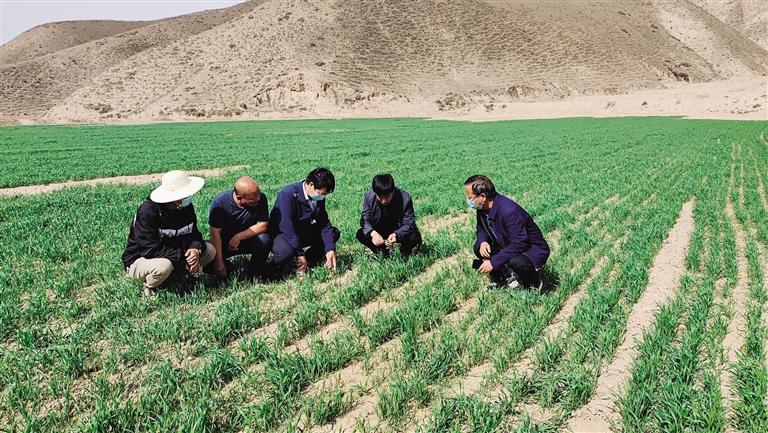 中國(guó)甘肅網(wǎng)5月11日訊 據(jù)蘭州日?qǐng)?bào)報(bào)道記者 程珊珊 文/圖)走進(jìn)皋蘭縣石洞鎮(zhèn)鎮(zhèn)東灣村的田間地頭,只見綠油油的麥田分布在村道兩旁,蘊(yùn)含綠色的期盼。皋蘭縣農(nóng)技中心主任王朝軍又下地了,帶著小鏟子、鋼卷尺等幾件從不離身的家伙。走進(jìn)麥田觀察根系、測(cè)量株高,細(xì)心查看苗情、墑情、肥情以及病蟲害情,而他的身邊還圍著不少村里的種糧大戶。