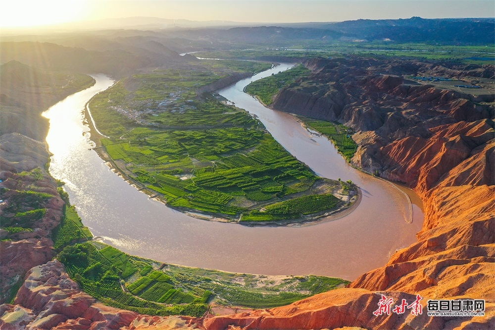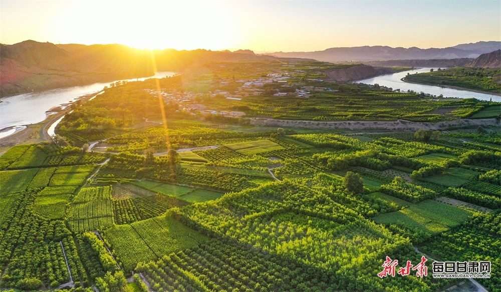 夏日,夕陽西下,黃河在景泰五佛鄉(xiāng)境內(nèi)的車木峽繞了個(gè)大大的彎,位于黃河峽谷中的 車木峽山村高山環(huán)繞,周圍是成片的樹林,廣袤的田野閃耀著瑰麗的色彩,靜靜地躺在綠色的懷抱之中。