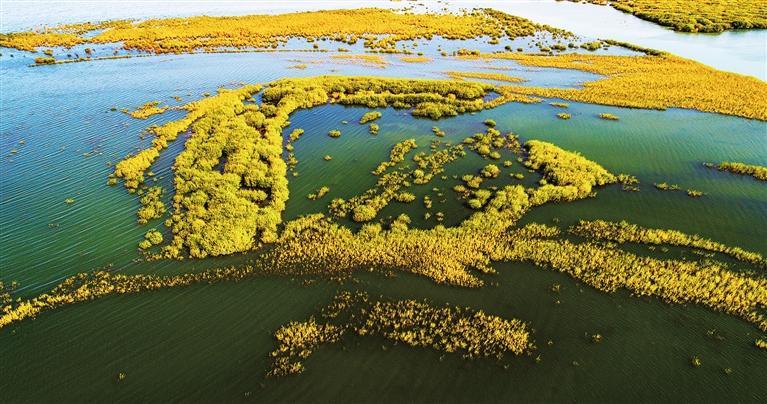 進(jìn)入10月,位于武威市民勤縣的亞洲最大沙漠水庫(kù)——紅崖山水庫(kù)群鳥(niǎo)歡鳴,湖水碧藍(lán)。水柳倒映之下,猶如一朵朵金黃的秋菊盛開(kāi)。時(shí)值水鳥(niǎo)遷徙,大雁、白鷺、赤麻鴨、大天鵝等水鳥(niǎo)或在空中翱翔,或在湖中覓食,金黃金黃的胡楊樹(shù)葉閃爍鋪呈,一層又一層光暈,映照出一幅大漠水庫(kù)的金秋勝景。
