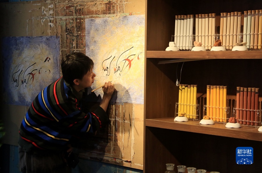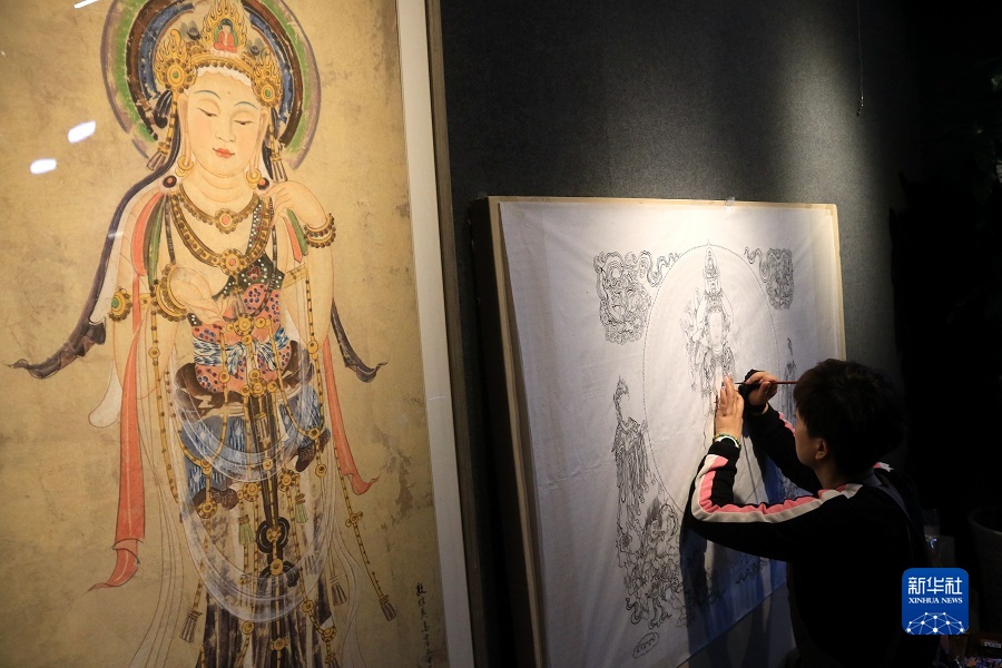 2月22日,在敦煌小鎮(zhèn)鳴沙書院,來(lái)自陜西的學(xué)員吳恩梵學(xué)習(xí)敦煌壁畫臨摹技藝。