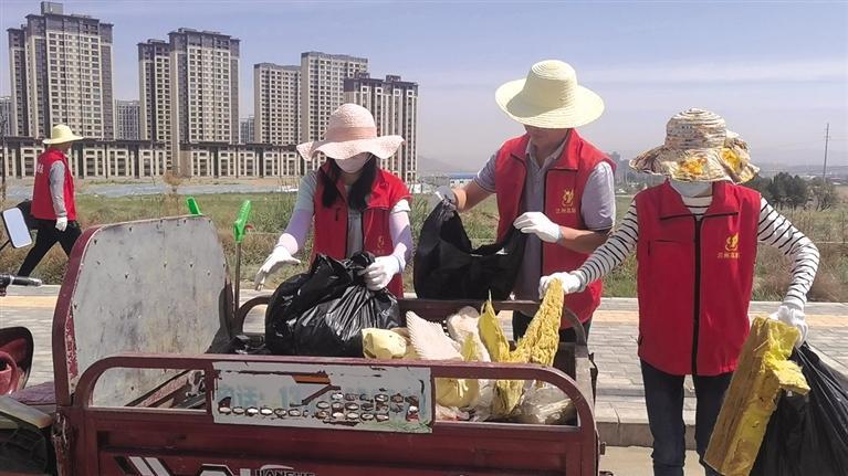 在劉先生身后不遠(yuǎn)處,志愿者、網(wǎng)格員、環(huán)衛(wèi)工人等正在清理路旁垃圾,此時(shí)正值上午10時(shí)30分,驕陽似火,在經(jīng)四路與緯二十二路交界處,大家不畏炎熱,認(rèn)真撿拾著散落四處的垃圾,不論是煙頭紙片、白色垃圾,還是在雜草間的雜物,都被一一撿出,放在隨身攜帶的垃圾袋中,統(tǒng)一放回垃圾清運(yùn)車。