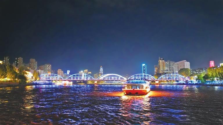 夜幕降臨,黃河兩岸璀璨霓虹逐一亮起,蘭州白塔山碼頭游船售票處、登船安檢處排起了數(shù)十米的長隊(duì),“金城壹號(hào)”“悠游蘭州號(hào)”“墨跡號(hào)”等十多艘游輪載著南來北往的游客穿梭于黃河之上,為夜晚的黃河之濱添了一抹流動(dòng)的色彩。