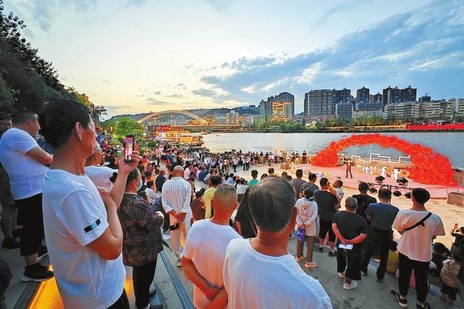 19日,游客在黃河岸邊欣賞黃河之濱百日千場音樂展演活動(dòng)。新華社照片