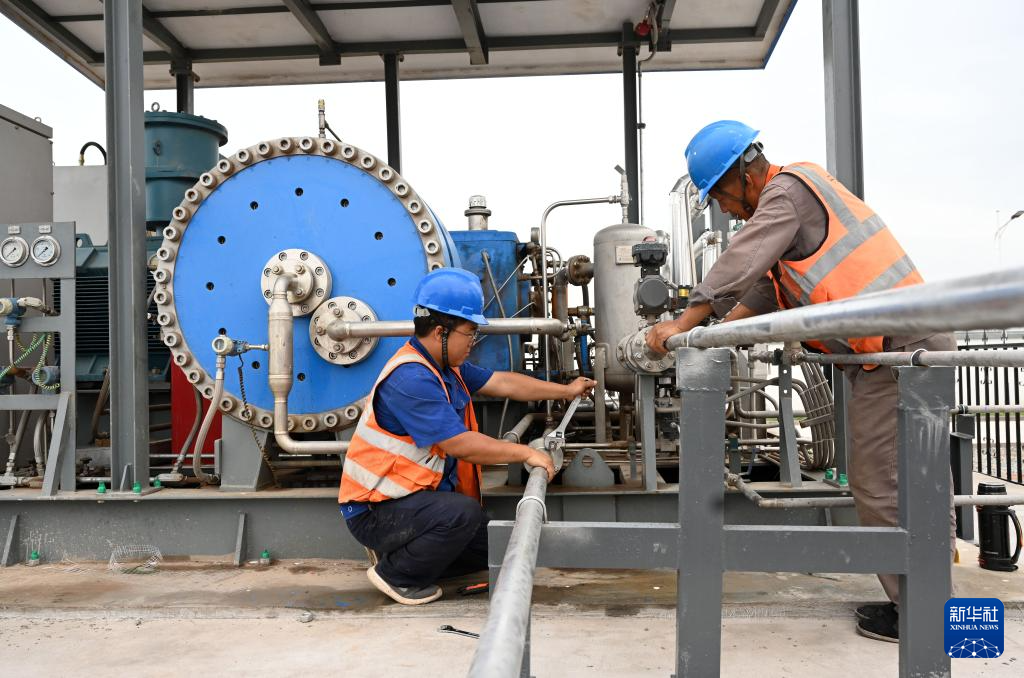 8月10日,工人在中國能建張掖氫能綜合應(yīng)用示范項目調(diào)試氫氣加壓裝置。新華社記者 金良快 攝
