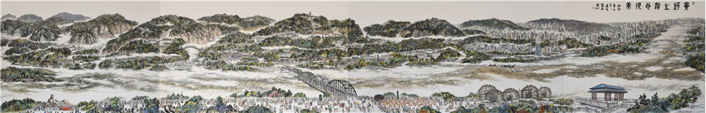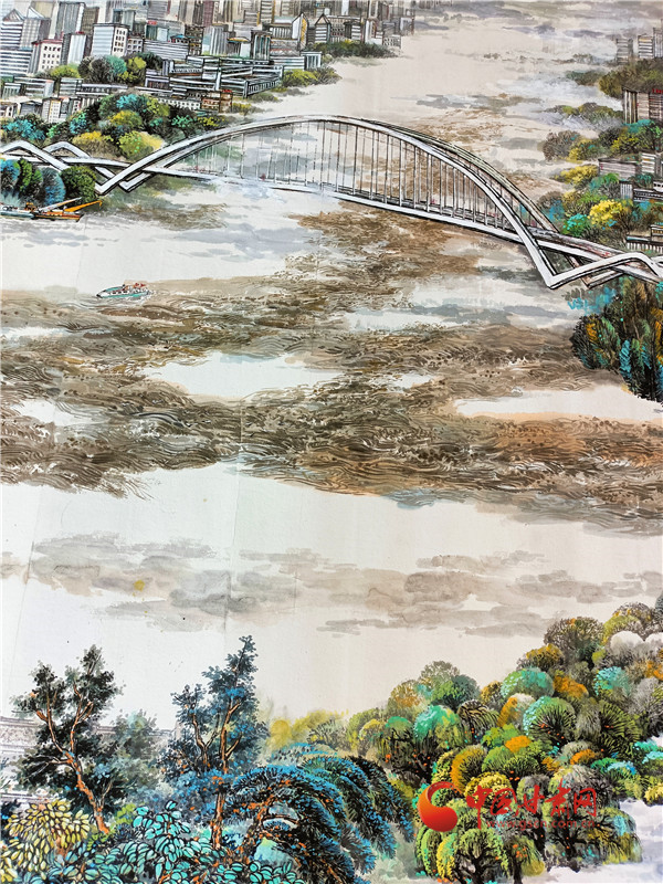 在《黃河之濱也很美》的長(zhǎng)卷中,有黃河母親雕塑,有中山橋,有白塔,也有城市規(guī)劃館,有羊皮筏子也有疏通河道的船。