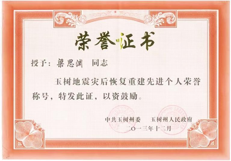 他一直這樣嚴(yán)于要求自己。因在格薩爾王賓館地震遺址維修保護(hù)項(xiàng)目中作出突出貢獻(xiàn),梁思淵被玉樹州委、州政府評為“玉樹地震災(zāi)后恢復(fù)重建先進(jìn)個人”。疫情期間,他主動請纓,參與雁南路街道防疫物資運(yùn)輸保障任務(wù),轉(zhuǎn)運(yùn)物資總計(jì)150多趟次。