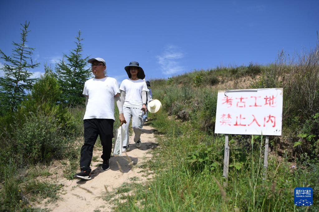 四角坪遺址考古領(lǐng)隊、甘肅省文物考古研究所副研究館員侯紅偉(前)帶領(lǐng)考古專業(yè)研究生在甘肅省隴南市禮縣四角坪遺址考古發(fā)掘現(xiàn)場工作(2022年6月10日攝)。新華社記者 郎兵兵 攝