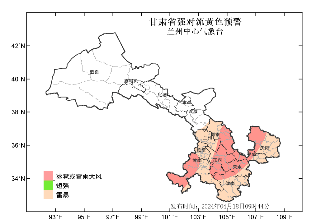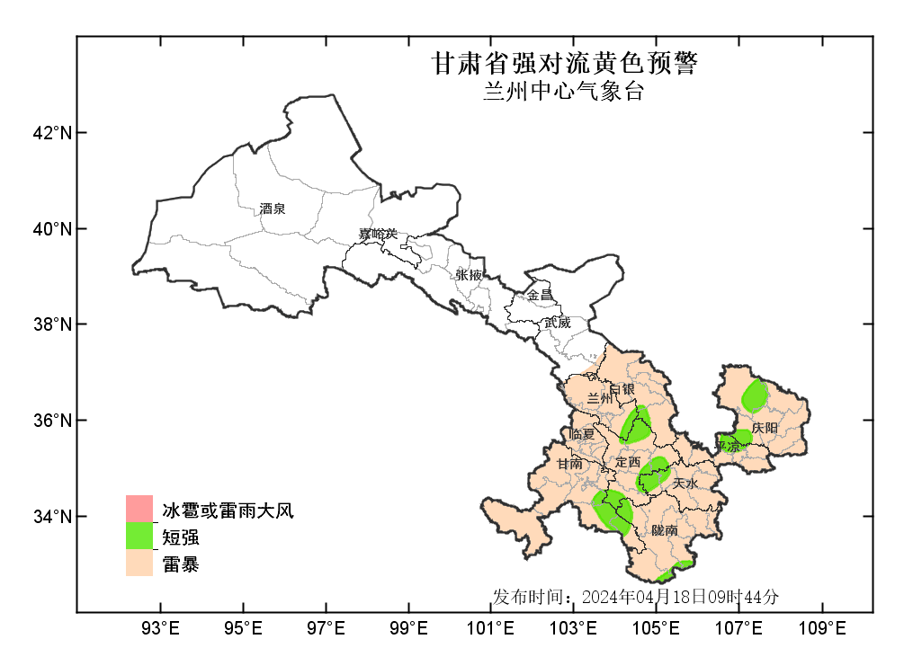 中國甘肅網4月18日訊(西北角·中國甘肅網記者 沈文剛)4月18日9時44分,蘭州中心氣象臺發(fā)布強對流黃色預警:預計今天白天到夜間,武威以東大部分地方有雷暴;其中,白銀、定西、甘南、天水等市州部分地方及蘭州、隴南、平涼、慶陽等市局部地方有雷雨大風或冰雹;甘南、隴南、定西、天水、白銀、蘭州、平涼、慶陽等州市局部地方有短時強降水,最大小時雨強為20-30毫米。