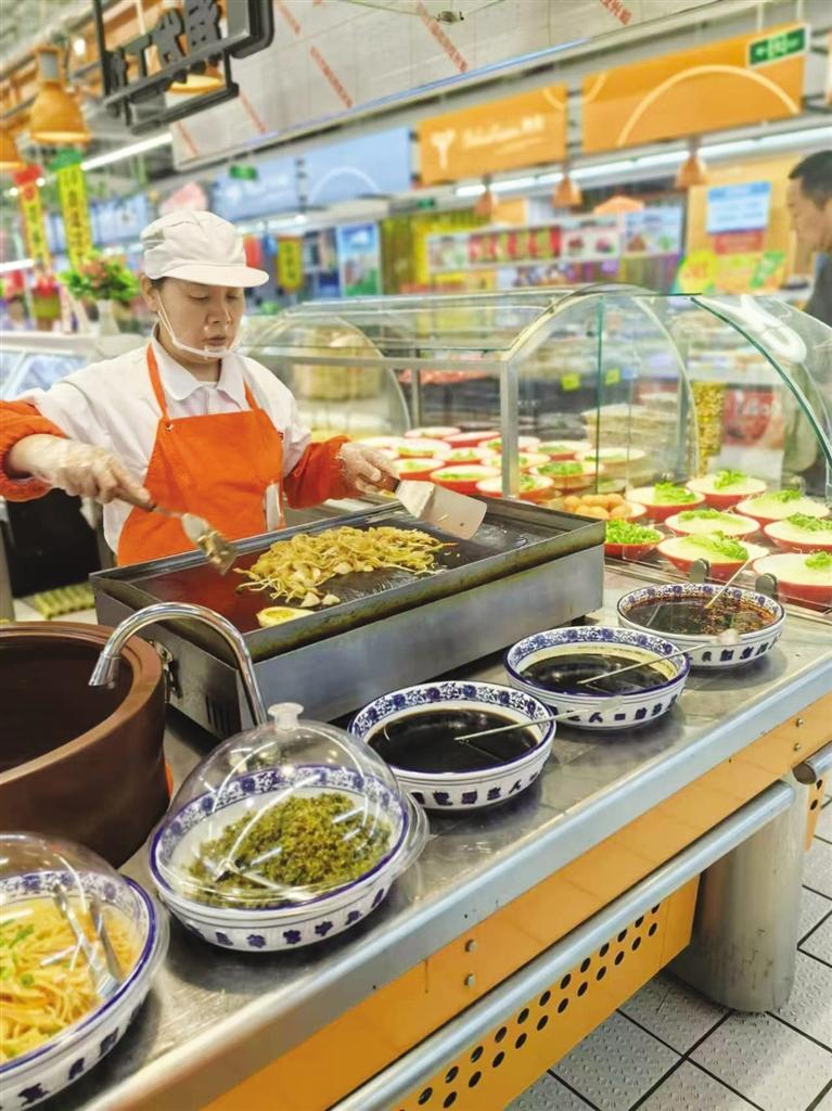 超市里的“平價(jià)食堂”,成為打造一刻鐘便民生活圈的重要載體。“超市周邊的居民、上班族、學(xué)生、酒店差旅客群的基礎(chǔ)比較大,所以增加快餐、堂食也是超市的一項(xiàng)便民舉措。”超市里升騰起的煙火氣,也讓超市的來(lái)客率明顯提升,“周末時(shí),油條的銷量能達(dá)到1000根、豆腐腦能賣到500碗,不管是檔口、自助收銀機(jī)都有排隊(duì)的顧客。”