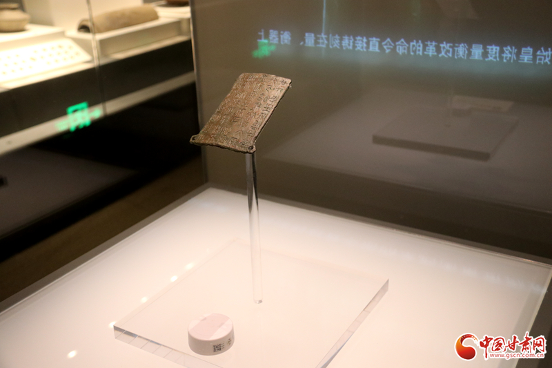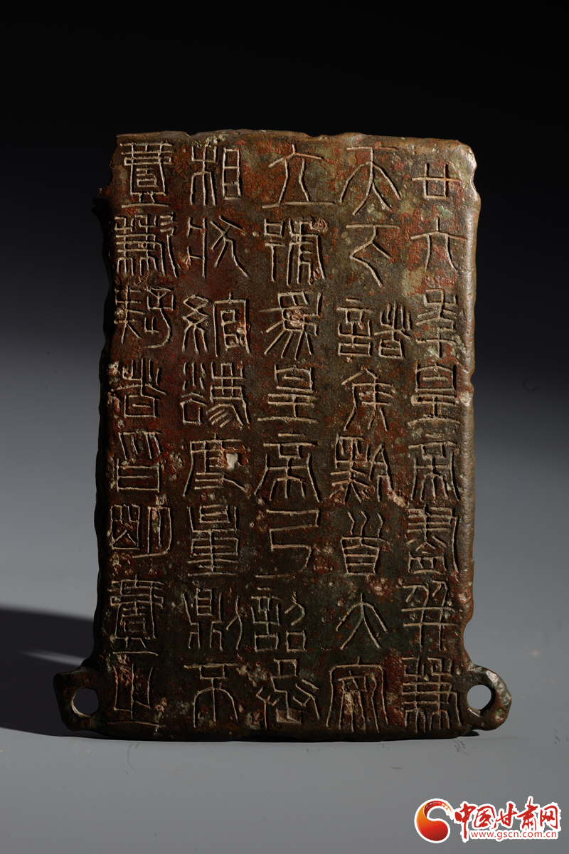 中國甘肅網9月14日訊(西北角·中國甘肅網記者 孫珩力)秦詔版,是指刻有秦始皇或秦二世統(tǒng)一度量衡詔書的銅版,有的鑲在鐵權、銅權上;有的四角有孔,用以釘在木頭的量器上。目前我國出土的刻有秦始皇詔文的遺物有銅橢量、銅錢等,不僅數(shù)量多而且分布也廣,而像這樣把詔文刻在銅版上的詔版形式在全國極為罕見,鎮(zhèn)原縣博物館收藏的就是其中之一,可謂稀世珍品。
