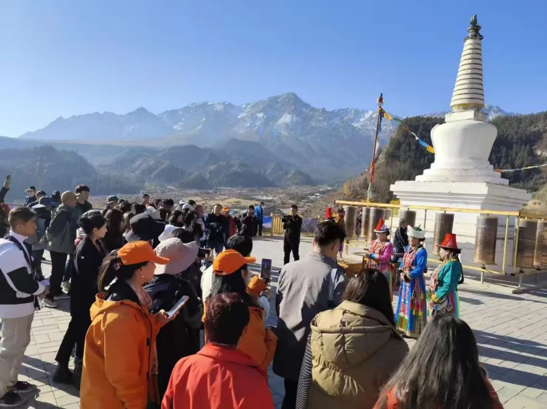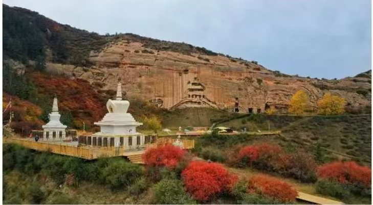 18日上午,迎著耀眼的晨光,采訪團成員乘坐大巴車來到了集自然風光、石窟藝術、民族風情、宗教文化于一體的肅南馬蹄寺。馬蹄寺是河西走廊著名的佛教勝地,石窟群開鑿于十六國北涼時期,距今約1600年的歷史,是絲綢之路上至關重要的歷史文化瑰寶,也是我國早期石窟的杰出代表。秋日的馬蹄寺,秋高氣爽,景色宜人,遠遠看去,紅綠相間,層林盡染,大家行走在落葉飄零的山間小路上,對這座建在懸崖峭壁之上、將棧道鑲嵌在山體之內的石窟充滿了好奇。
