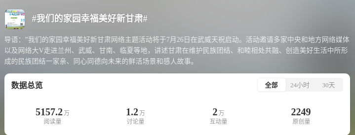 為深化互動引導(dǎo),打造高流量IP,@甘肅網(wǎng)信、@快看甘肅等官方賬號發(fā)起社交平臺互動話題#我們的家園幸福美好新甘肅#。結(jié)合#厚道甘肅##萬千氣象看甘肅#等話題,@中新觀隴、@中國甘肅網(wǎng)、@甘肅好網(wǎng)民、@蘭州新區(qū)發(fā)布、@甘南融媒等賬號同步發(fā)力、同頻共振。目前,該話題總閱讀量超5530萬人次,討論互動量3.2萬人次。