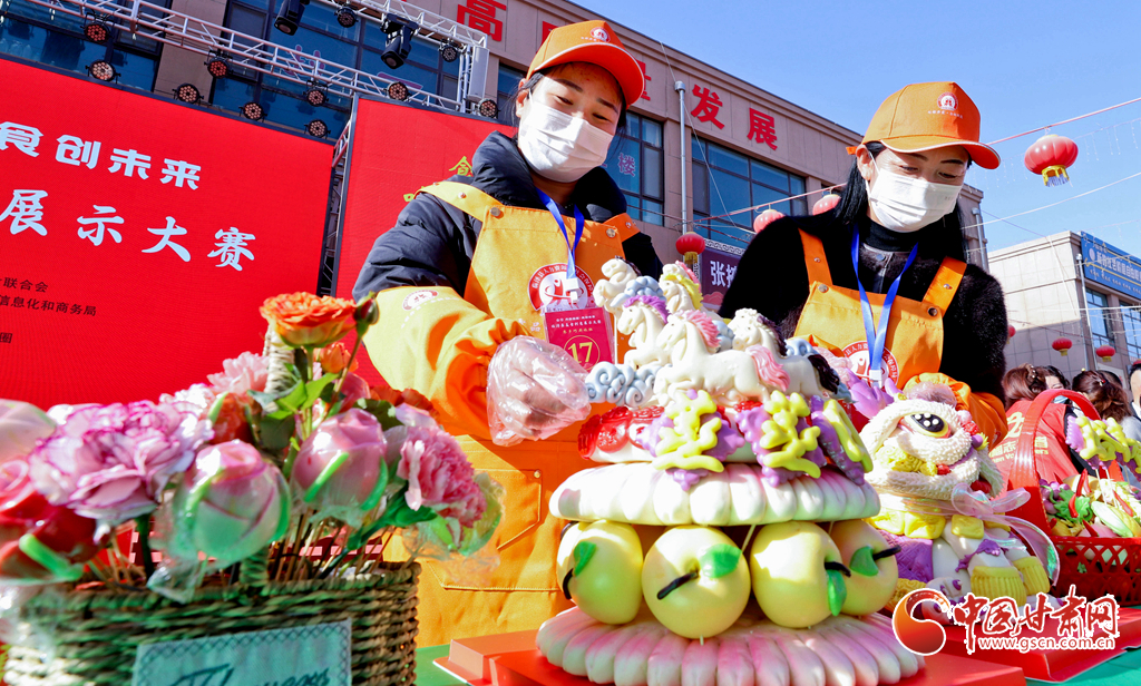 3月5日,臨澤縣金澤廣場(chǎng)美食創(chuàng)意展示大賽現(xiàn)場(chǎng),農(nóng)家巧廚娘在展示“八駿風(fēng)馳”特色花饃。