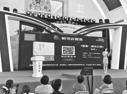 2020上海書展首次啟用了新書“云首發(fā)”的形式。8月15日,在《蒙曼:唐詩之美》新書“云首發(fā)”現(xiàn)場(chǎng),讀者可以掃描大屏幕上的二維碼進(jìn)行圖書購買。