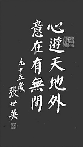 張先生的人生是圓滿的。趙樸初《遺囑》說(shuō):“生固欣然,死亦無(wú)憾?;溥€開(kāi),水流不斷。我兮何有,誰(shuí)歟安息?明月清風(fēng),不勞尋覓。”弘一法師《辭世二偈》之二說(shuō):“華枝春滿,天心月圓。”這些遺言,都顯示了一種人生圓滿的喜悅。張先生書(shū)法集中的兩句話:“心游天地外,意在有無(wú)間。”同樣顯示了一種人生圓滿的喜悅。