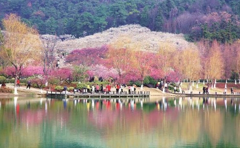 進(jìn)入景區(qū),走過(guò)一座石拱橋,眼前,一汪清水,綠意萌發(fā),乃傳說(shuō)的“鹿女湖”。不時(shí)用手撩撥著拂面的楊柳,沿湖畔小徑繞行數(shù)百米,往上攀登,穿過(guò)一個(gè)山口,整個(gè)梅嶺景區(qū),便不驚不乍,呈現(xiàn)在眼前。霎時(shí),我們被如此壯觀的山水梅林驚呆了。清凌凌的湖水邊、亭臺(tái)水榭間,依山而栽種的梅樹,紅的、白的、粉的、綠的梅花,競(jìng)相綻放,層層疊疊、婆娑飛舞,爭(zhēng)芳斗艷、姹紫嫣紅,儼然一幅3D山水畫,仿佛置身“香國(guó)仙境”。