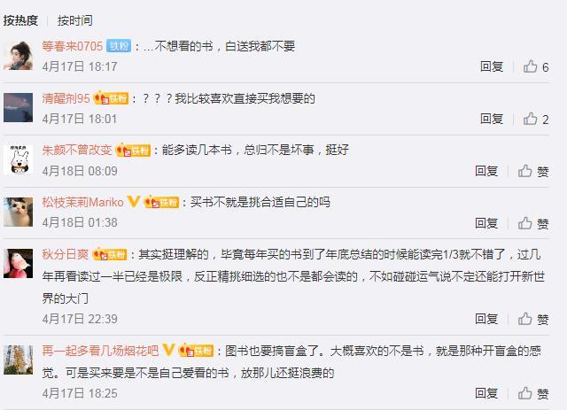 此前,部分網(wǎng)友在中新經緯微博評論對“圖書盲盒”現(xiàn)象開展討論。有網(wǎng)友提到,“其實挺理解的,畢竟每年買的書到了年底總結的時候能讀完1/3就不錯了,過幾年再看讀過一半已經是極限,反正精挑細選的也不是都會讀的,不如碰碰運氣說不定還能打開新世界的大門。”也有網(wǎng)友認為,“不想看的書,白送我都不要”“買書不就是挑合適自己的嗎”等等。