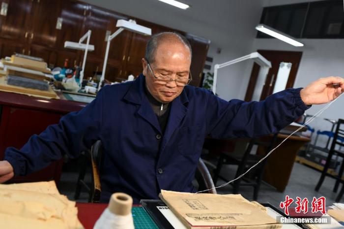 圖為師玉祥將修復(fù)完成的古籍進行穿線訂書。 楊華峰 攝