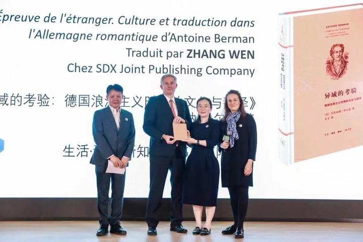 法國駐華大使羅梁(左二)為社科類獲獎譯者頒獎。法國駐上海總領(lǐng)事館供圖