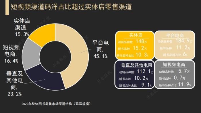 另外,2022年零售圖書(shū)市場(chǎng)中,短視頻電商碼洋占比趕超實(shí)體店渠道零售占比。目前短視頻電商作為新興電商,聚集越來(lái)越多的用戶注意力。