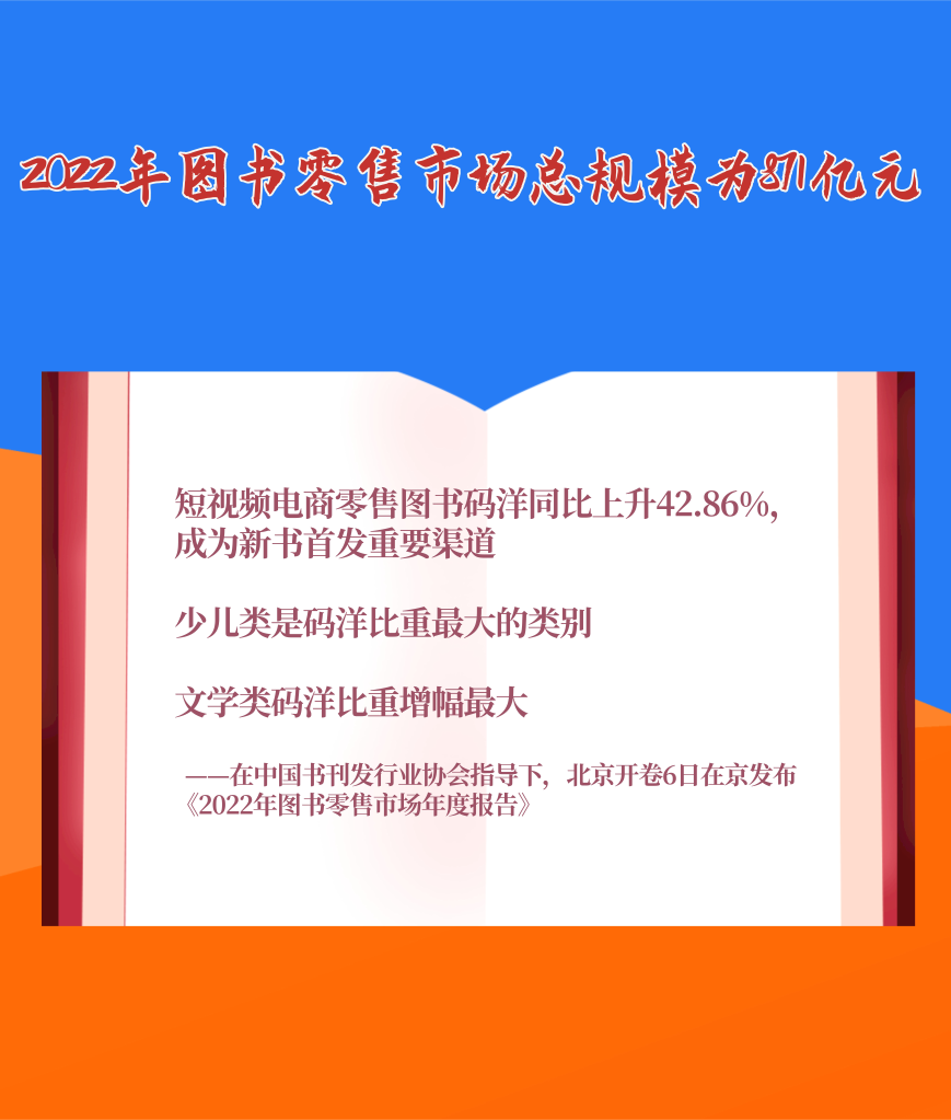 1月6日,在中國(guó)書(shū)刊發(fā)行業(yè)協(xié)會(huì)指導(dǎo)下,北京開(kāi)卷信息技術(shù)有限公司在京發(fā)布《2022年圖書(shū)零售市場(chǎng)年度報(bào)告》。報(bào)告顯示,2022年我國(guó)圖書(shū)零售市場(chǎng)碼洋規(guī)模為871億元。短視頻電商零售圖書(shū)碼洋同比上升42.86%,碼洋占比趕超實(shí)體書(shū)店,成為新書(shū)首發(fā)重要渠道。