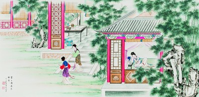 寶玉順腳一徑來到瀟湘館,信步走入,只見鳳尾森森,龍吟細細,悄無人聲。走至窗前,一縷幽香從碧紗窗中暗暗透出。寶玉便將臉貼在紗窗上,往里看時,耳內(nèi)忽聽得細細的長嘆了一聲道:“每日家情思睡昏昏。”譚鳳嬛繪