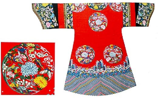 故宮藏大紅緙絲彩繪八團(tuán)梅蘭竹菊紋夾袍及紋樣 選自《遇見中國(guó)服飾藝術(shù)》