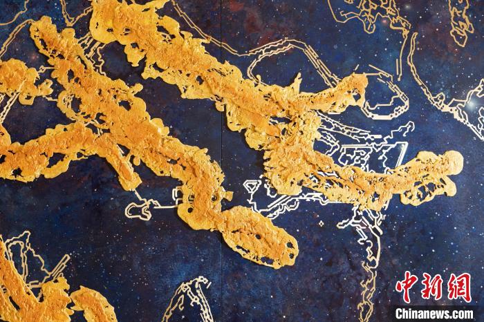 記者了解到,這幅熔銅壁畫(huà)采用國(guó)家級(jí)非遺銅雕技藝,結(jié)合熔銅藝術(shù)、釉彩著色等創(chuàng)新技藝制作而成,從設(shè)計(jì)、制作、誕生,全程歷時(shí)一年,難度很大。壁畫(huà)以朱炳仁手繪的星空“云水墨”制作,用大面積深藍(lán)宇宙為底,采用熔銅藝術(shù)構(gòu)成繁星點(diǎn)點(diǎn)。