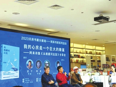 2023天府書展,各種名家分享會(huì)讓讀者應(yīng)接不暇。除了成都世紀(jì)城新會(huì)展中心主會(huì)場(chǎng),分會(huì)場(chǎng)的活動(dòng)也精彩紛呈。10月15日下午,在西部文化產(chǎn)業(yè)中心阿來書房,阿來、葉舟、梁平三位名家開啟“我的心房是一個(gè)巨大的蜂巢——阿來詩(shī)集《從梭磨河出發(fā)》分享會(huì)”。三人上演老友記,分享會(huì)由阿來的青春期談起,氛圍詼諧幽默、愜意深情。