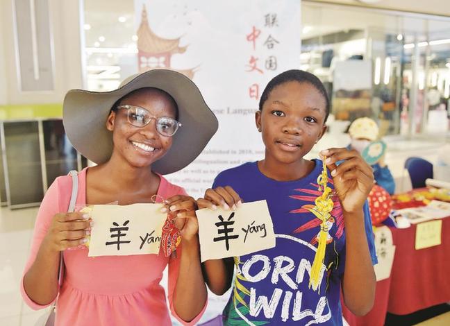 20日,孩子們?cè)诓┐耐呒{哈博羅內(nèi)舉行的中文日慶?;顒?dòng)上展示漢字。 新華社發(fā)