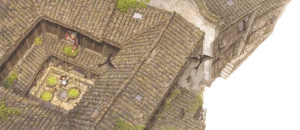 全書以時(shí)間和空間的變化為順序,以外公的搖船劃開故事的序幕,讓充滿煙火氣的江南生活伴隨著搖櫓聲和水聲悠悠緩緩地展現(xiàn)。江南盛產(chǎn)絲綢,養(yǎng)蠶是江南的常見活計(jì)。一大清早,外公外婆的勞作就開始了。外公劃船去鎮(zhèn)外采來桑葉,外婆在天井晾干桑葉上的露水,而丫丫喜歡在天井里玩耍,由此帶出了天井里“四水歸堂”的水槽設(shè)計(jì)知識(shí)。丫丫折紙船讓它順著回字形的水槽漂到外面的河里去,這一游戲帶來了有趣的細(xì)節(jié)。曬完桑葉,一家人在亭子間吃早飯,路過的漁船隨手拋來鮮魚,此舉揮灑的是淳樸的鄉(xiāng)間情意。早飯后,丫丫幫外婆把桑葉搬到閣樓上去喂蠶寶寶,養(yǎng)蠶的愉悅在蠶吃桑葉的聲音中奏響。日頭升高時(shí)店鋪開張,外婆賣蠶絲品,丫丫也順帶著賣她親手養(yǎng)的蠶繭。小鎮(zhèn)人靠養(yǎng)蠶來自給自足的生活,平淡而安逸。除了養(yǎng)蠶,江南人家還自制特色小菜。“外婆最珍惜陽光。南方雨水太多,遇到一個(gè)難得的大晴天,外婆就跟從老天爺那里白得了寶貝似的,喜滋滋地把閣樓的天窗打開,在黑瓦的屋頂上擺上一個(gè)個(gè)大竹匾,曬她一刀一刀切出來的蘿卜干、茄子干和筍干。”這些一刀一刀切出來、一日一日曬出來的家鄉(xiāng)的味道會(huì)留存舌尖,讓外出的游子留戀。順著屋頂眺望,連片的房舍和高大的馬頭墻赫然可見。有意思的是,橋上的廊檐讓孩子們雨天也有玩處;而晚間在臨水戲臺(tái)上的昆曲演出則使小鎮(zhèn)人們歡聚一堂,臺(tái)下臺(tái)上組成熟悉又夢幻的世界,讓丫丫陶醉其中……