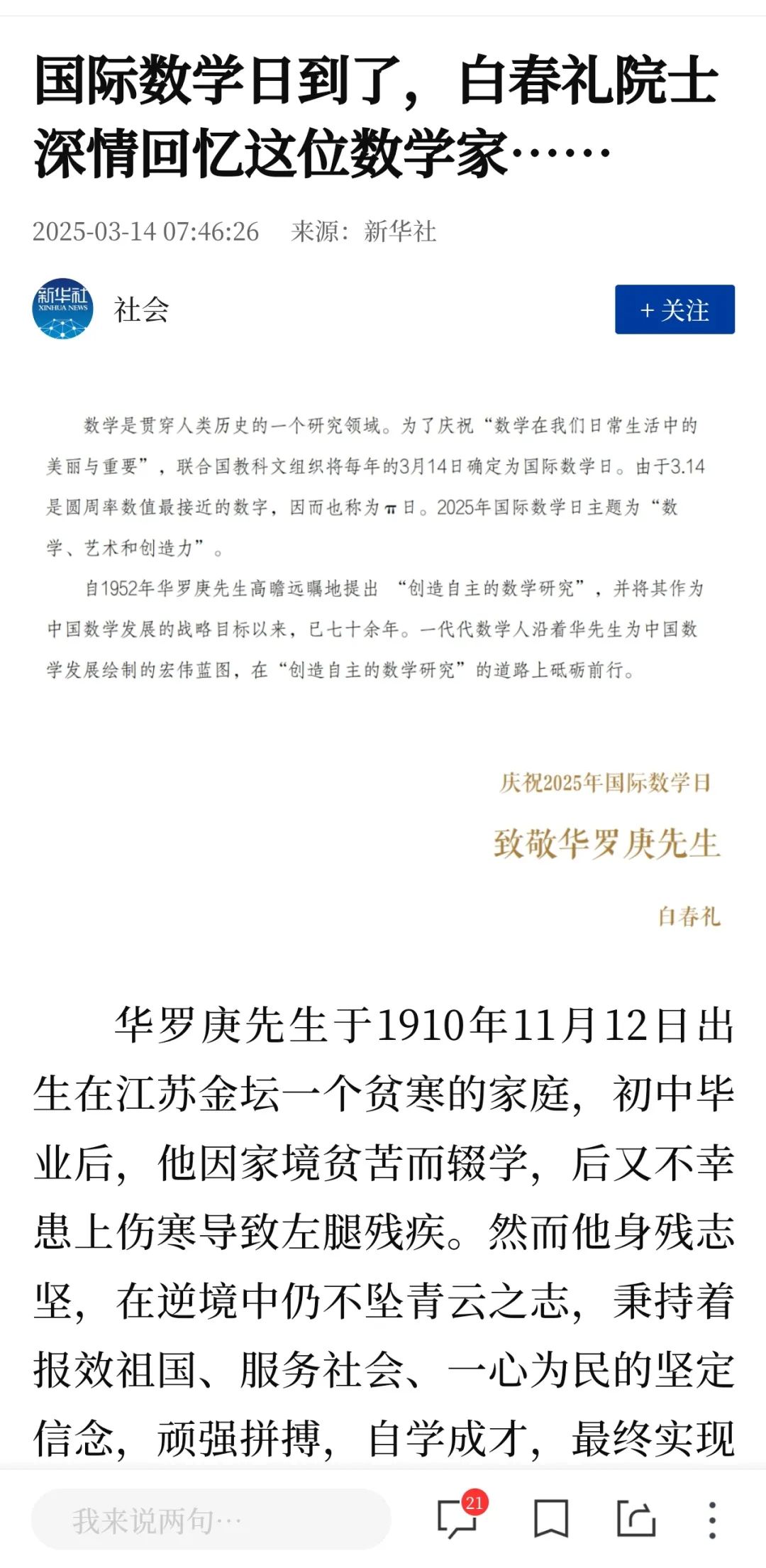 新版問(wèn)世后,白春禮院士在新華社撰文《國(guó)際數(shù)學(xué)日到了,白春禮院士深情回憶這位數(shù)學(xué)家......》力薦本書(shū),獲超150萬(wàn)閱讀量。