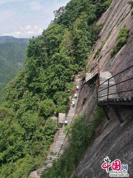 在走下第一級棧道的時(shí)候,我就暗暗告誡自己,上山容易下山難,一定不能樂極生悲,小心腳下,謹(jǐn)防腿軟滾摔。于是,我始終保持著有一只手扶著安全鐵護(hù)欄,一路扶著下階。來到平緩處,抬起手,竟然發(fā)現(xiàn)手上并沒有沾上多少鐵銹或灰塵。原來護(hù)欄上一溜光滑如新,可見來此攀登者并非少數(shù)。再者,在這天地盡皆干凈之處,塵埃自然沒有了蹤影。