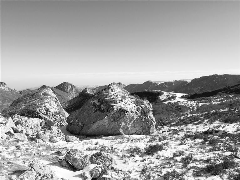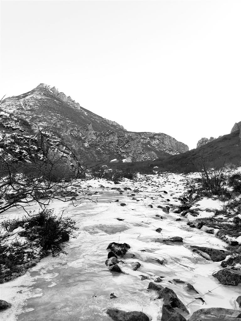 穿過公路就來到露骨山腳下,山間灌木叢生,枯葉凋零,一夜的小雪也使天空更加清澈。上山的路,總體是溯溪而上,不過腳下的小溪已經(jīng)變成冰河,但潺潺水聲不時在耳邊響起,大小石塊橫亙在冰河之上,白雪覆蓋其間,我們一行沿著前人在雪地留下的腳印,撥開齊胸的灌木枝,深一腳淺一腳、兜兜轉轉向前行。