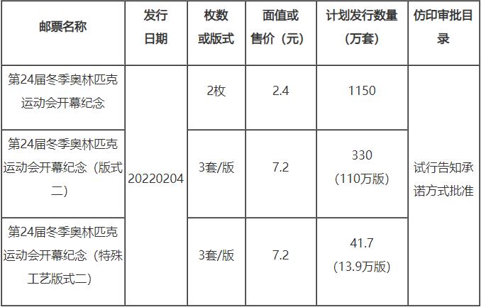 今日,國(guó)家郵政局公布《第24屆冬季奧林匹克運(yùn)動(dòng)會(huì)開幕紀(jì)念》紀(jì)念郵票計(jì)劃發(fā)行數(shù)量及仿印審批目錄情況。
