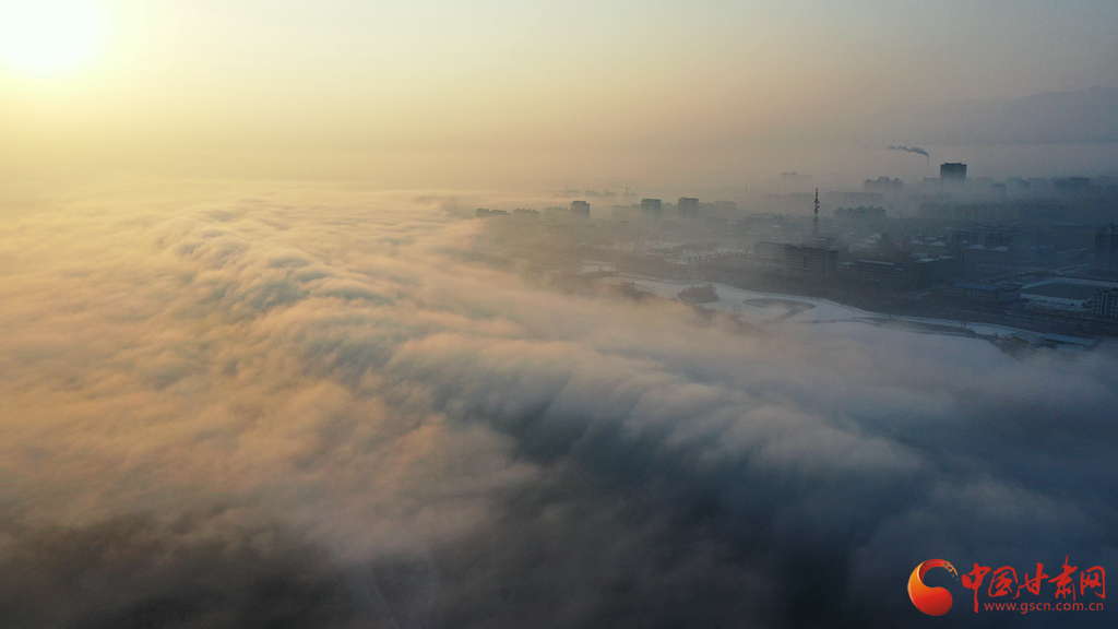 張掖市高臺縣黑河國家城市濕地公園上空的云海景觀。