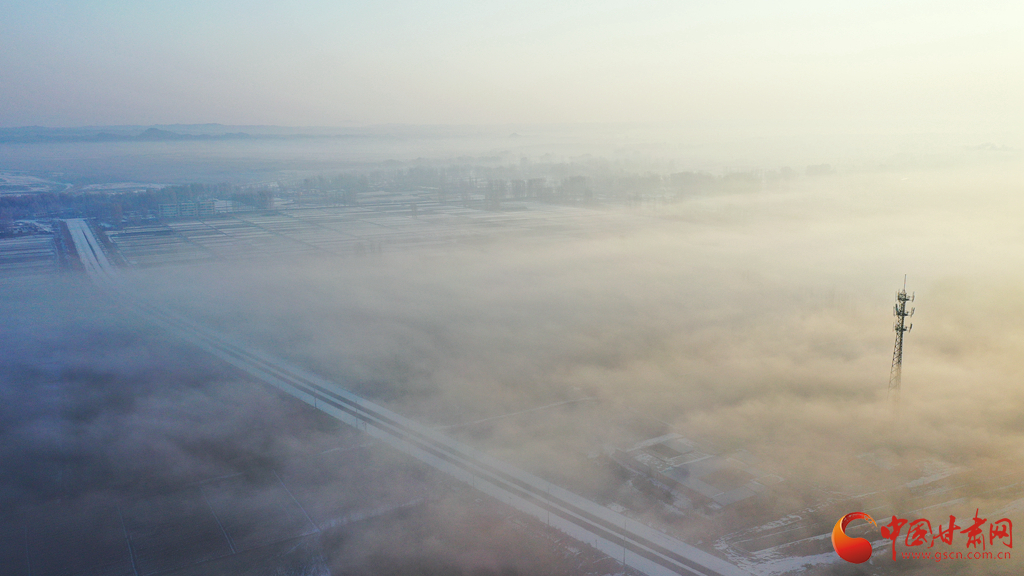 2月8日清晨,甘肅張掖市高臺縣黑河國家城市濕地公園上空霧浪翻滾,虛無縹緲,恍如天宮仙境,呈現(xiàn)出海市蜃樓般的云海奇觀,在陽光的照射下,格外美麗。由于多年來黑河生態(tài)治理,冬天封凍,加之近日大范圍的降雪低溫天氣,黑河的水面上經(jīng)常霧氣蒸騰,兩岸的樹木玉樹瓊花,形成霧凇景觀,如同童話世界里的仙境一般圣潔,令人心曠神怡。