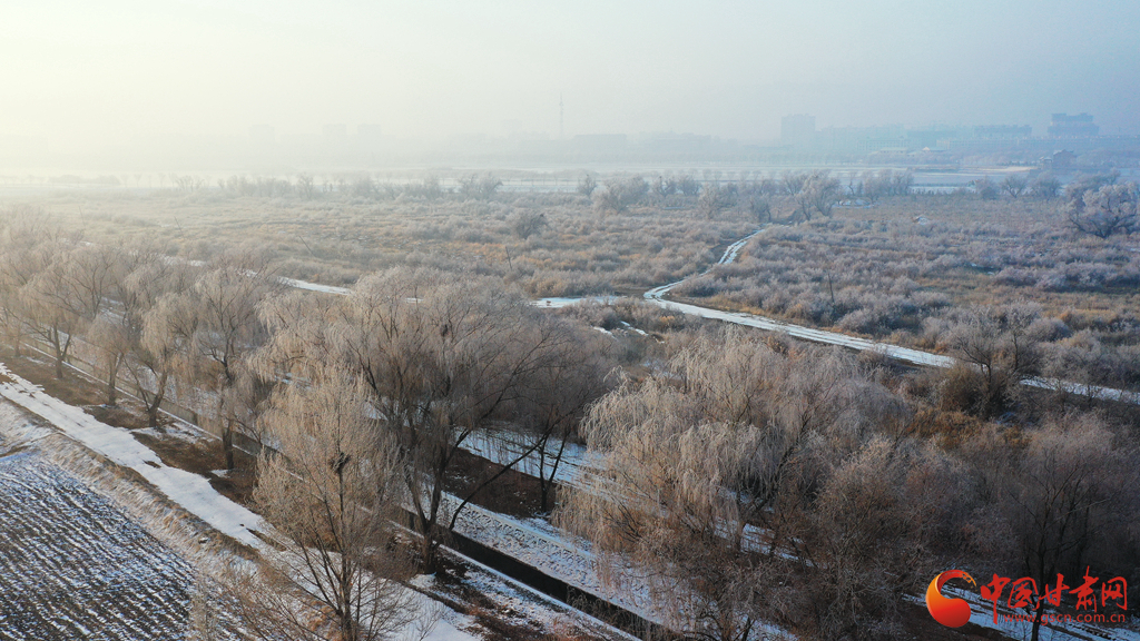 張掖市高臺縣黑河國家城市濕地公園的霧凇景觀。