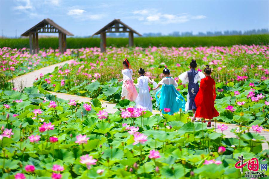 寧夏沙湖: 接天蓮葉無(wú)窮碧 國(guó)風(fēng)漢服映荷塘(圖)