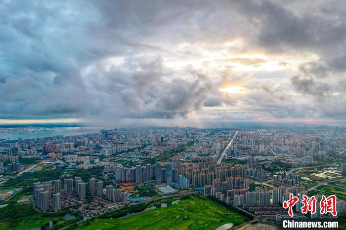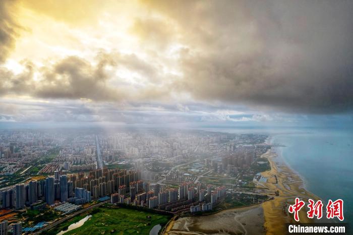 圖為陽光穿過云層照耀北海市城區(qū)?!⌒旖B榮 攝