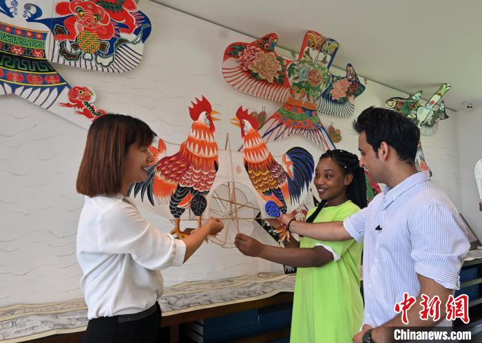 中新網廊坊7月21日電 (李玉素 宋敏濤)21日,來自河北師范大學的尼日利亞籍留學生馬臻和巴基斯坦籍留學生烏瑪爾,來到河北省廊坊市安次區(qū)第什里風箏小鎮(zhèn),體驗中國傳統(tǒng)的風箏文化。