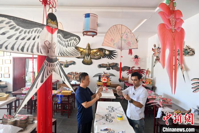 巴基斯坦籍留學生烏瑪爾(右)跟隨第什里風箏第五代傳承人趙艷強(左)學習傳統(tǒng)風箏制作?!〉杂鸺?nbsp;攝