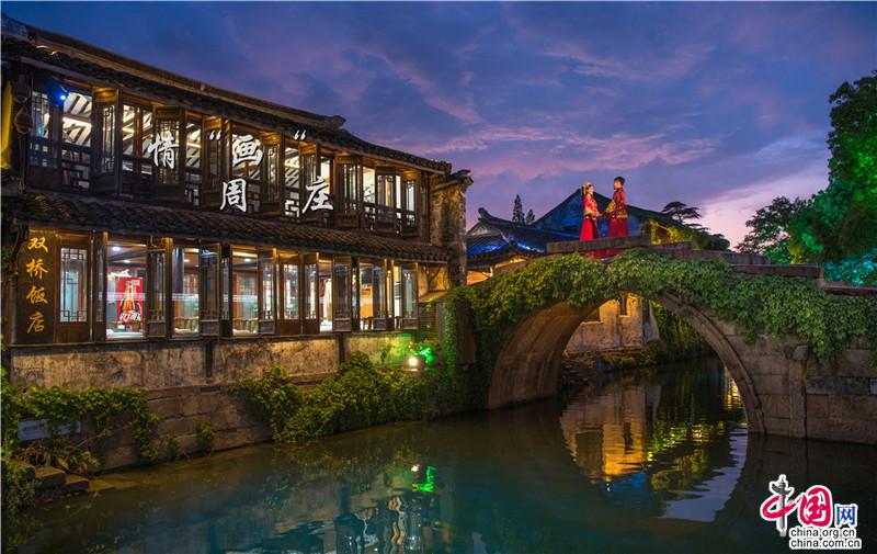 雙橋如畫,入畫周莊。牛郎織女七夕鵲橋相會(huì),而我與你邂逅在江南水鄉(xiāng)。人間煙火至,攜手水鄉(xiāng)游,夜色下隱隱約約的古橋,仿佛是叩響幸福之門的鑰匙,溫柔靜默,流淌著時(shí)光,好似走過(guò),便可白頭偕老。