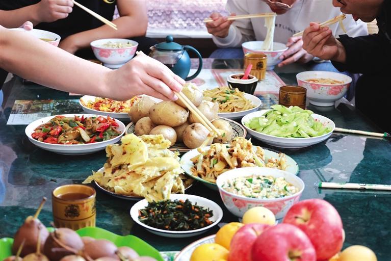 金萬(wàn)裕今年77歲,留著山羊須,筋骨強(qiáng)健,精神矍鑠。他家有21畝地,洋芋今年就種了10畝。當(dāng)天,是他家挖洋芋的第二天,孫子挖,金萬(wàn)裕撿。這里的紅洋芋,淀粉含量高,秧有半人之高。臨近中午,金萬(wàn)裕邀記者回家吃洋芋。在寬敞透亮的新房子里做客,喜悅的氣氛和一桌洋芋宴足以讓人解饞、解乏,尤其是“破皮襖”(油壺喧)就洋芋菜,簡(jiǎn)直是一絕。種植一直是金家的一份可觀收入,洋芋、大豆都是盼頭,如今房子住套院,孫子在開(kāi)塔吊,三代人和諧幸福。